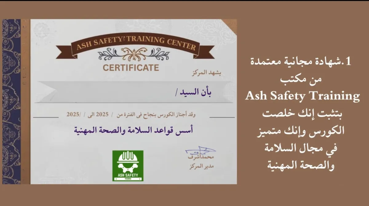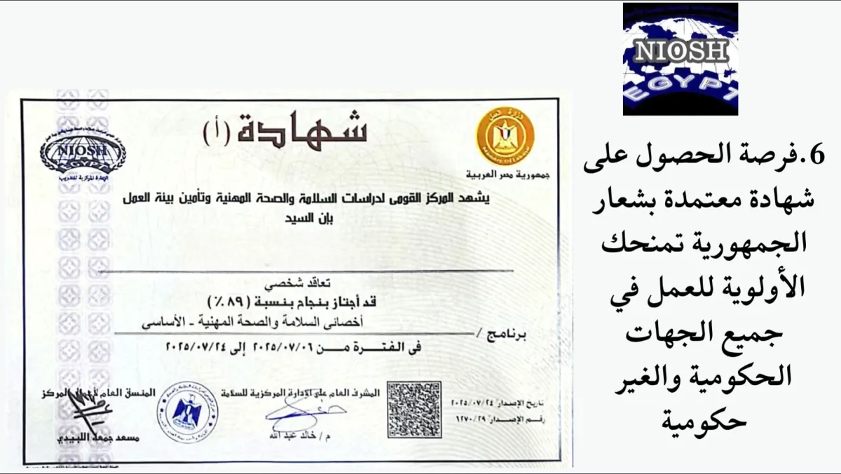أسلوبنا وخبرتنا في التدريب علي أساسيات وقواعد السلامة والصحة المهنية يحقق لك أفضل وأسرع النتائج في تصرفك الصحيح والتلقائي ، وقت وقوع الحوادث المفاجئة ، وبنساعد تحصل علي شهادة من المركز القومي لدراسات السلامة والصحة المهنية معتمدة بشعار الجمهورية ، أمانك مسؤوليتك ، فلا تهمل فيها !!!